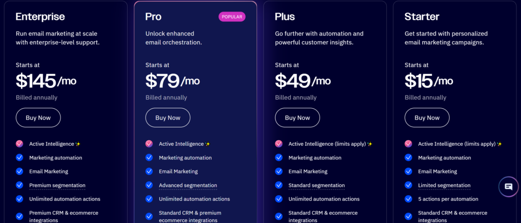 - Professional Plan: Designed for businesses that need advanced segmentation, predictive sending, and deeper analytics. The Professional tier offers more control and data insights to optimize campaigns.
